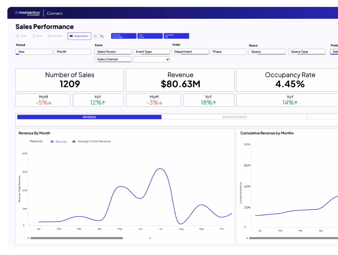 See revenue, utilization, and pacing in one place — plus how you compare to peer venues.